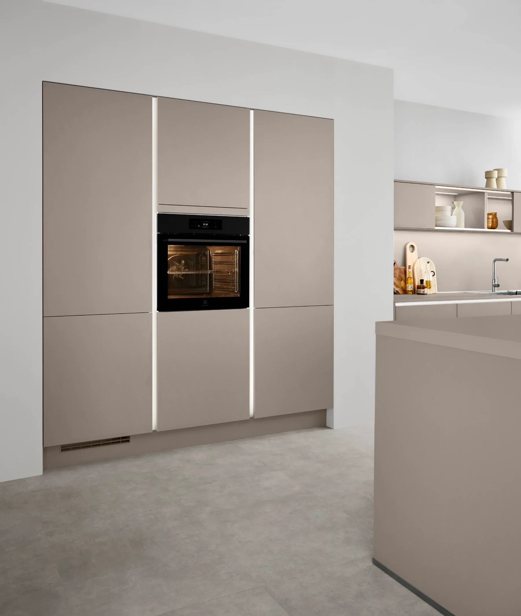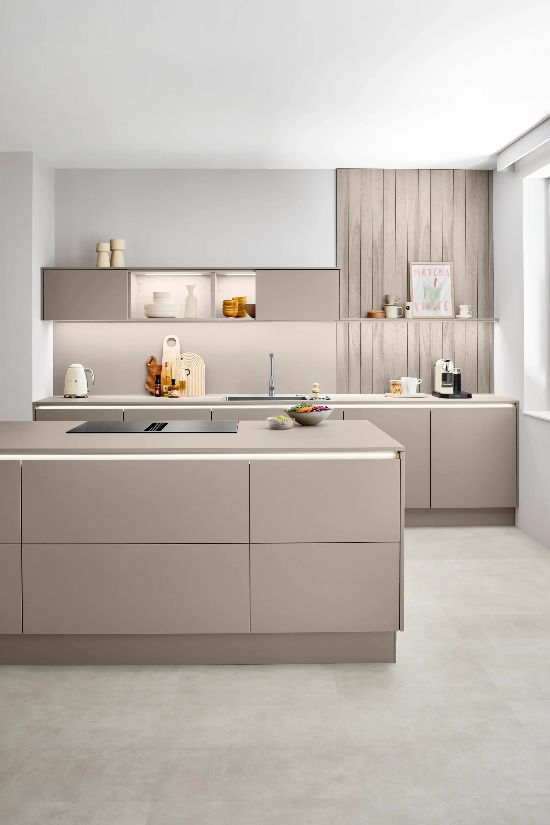 Laser is sleek and versatile, designed to maximise storage and functionality. Available in a variety of neutral colours to compliment any space or style, ensures an ergonomic and efficient workflow whilst making the most of your space. The quiet elegance of its smooth fronts beautifully accents its oak accents, whilst contrasting glass units add a soft, ambient warmth. .